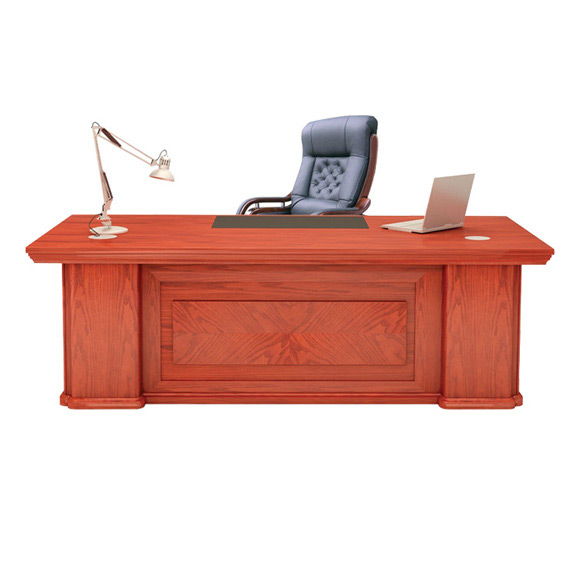 Bàn làm bằng gỗ Veneer kết hợp Melamine. Mặt bàn dạng chữ nhật vát cạnh xéo, bên trên có tấm PVC phần ngồi viết. Yếm bàn ốp nổi hình chữ nhật trang trí vân gỗ.Chân bàn dạng hộp.